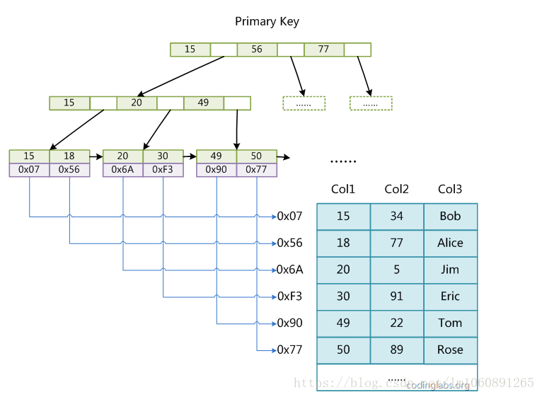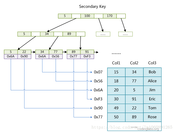 2)InnoDB的輔助索引InnoDB的所有輔助索引都引用主鍵作為data域。例如,下圖為定義在Col3上的一個輔助索引: