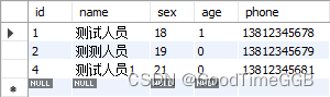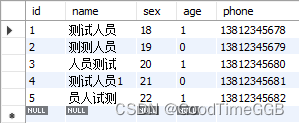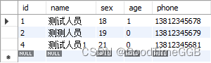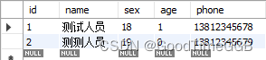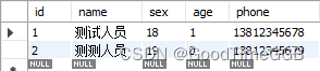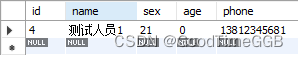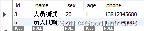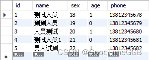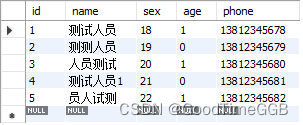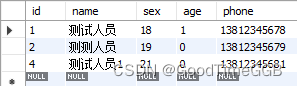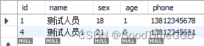 目錄一、建表并插入數據1、創建一個people表2、向people表添加數據二、查詢語句一、建表并插入數據1、創建一個people表DROP TABLE IF EXISTS `people`;CREATE TABLE `people` ( `id` int NOT NULL COMMENT '主鍵', `name` varchar(45) CHARACTER SET utf8mb4 COLLATE utf8mb4_0900_ai_ci NOT NULL COMMENT '姓名', `sex` tinyint NOT NULL COMMENT '性別', `age` int NOT NULL COMMENT '年齡', `phone` varchar(45) CHARACTER SET utf8mb4 COLLATE utf8mb4_0900_ai_ci NOT NULL COMMENT '聯系方式', PRIMARY KEY (`id`) USING BTREE) ENGINE = InnoDB CHARACTER SET = utf8mb4 COLLATE = utf8mb4_0900_ai_ci ROW_FORMAT = Dynamic;2、向people表添加數據insert into people values(1,'測試人員',18,1,'13812345678');insert into people values(2,'測測人員',19,0,'13812345679');insert into people values(3,'人員測試',20,1,'13812345680');insert into people values(4,'測試人員1',21,0,'13812345681');insert into people values(5,'員人試測',22,1,'13812345682');二、查詢語句-- 1、模糊查詢(單個條件)select * from people where name like '%測%';