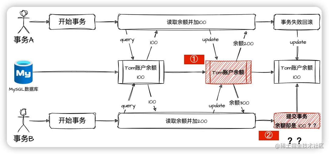 在①處,事務A得到的余額是200,事務B得到的余額是300,如果事務B是后更新,那么就覆蓋了事務A的值。