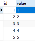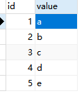 CREATE TABLE `test` ( `id` int(10) UNSIGNED NOT NULL AUTO_INCREMENT, `value` varchar(100) CHARACTER SET utf8 COLLATE utf8_general_ci NOT NULL, PRIMARY KEY (`id`) USING BTREE) ENGINE = InnoDB AUTO_INCREMENT = 8 CHARACTER SET = utf8 COLLATE = utf8_general_ci ROW_FORMAT = Dynamic;-- ------------------------------ Records of test-- ----------------------------INSERT INTO `test` VALUES (1, 'a');INSERT INTO `test` VALUES (2, 'b');INSERT INTO `test` VALUES (3, 'c');INSERT INTO `test` VALUES (4, 'd');INSERT INTO `test` VALUES (5, 'e');方法一以前以為set就是:key = value,沒想到可以直接將兩個字段放上去進行賦值。