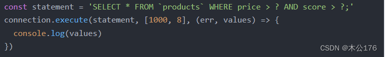 const mysql = require('mysql2')// 1.創建一個連接const connectionPool = mysql.createPool({ host: 'localhost', port: 3306, database: 'music_db', user: 'root', password: 'Coderwhy123.', // connectionLimit用來限制連接數量的 connectionLimit: 5})// 2.執行一個SQL語句: 預處理語句const statement = 'SELECT * FROM `products` WHERE price > ? AND score > ?;'connectionPool.execute(statement, [1000, 8], (err, values) => { console.log(values)})mysql2-Promise寫法