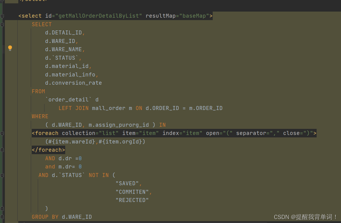 SEECT d.DETAIL_ID, d.WARE_ID, d.WARE_NAME, d.`STATUS`, d.material_id, d.material_info, d.conversion_rate,m.assign_purorg_idFROM `order_detail` dLEFT JOIN mall_order m ON d.ORDER_ID = m.ORDER_IDWHERE (d.WARE_ID,m.assign_purorg_id) in(('1','1910260249874688'),('54','1910264272376064'),('54','1910260249874688')) AND d.dr =0 and m.dr= 0 AND d.`STATUS` NOT IN ( 'SAVED', 'COMMITEN', 'REJECTED' )Mapper: