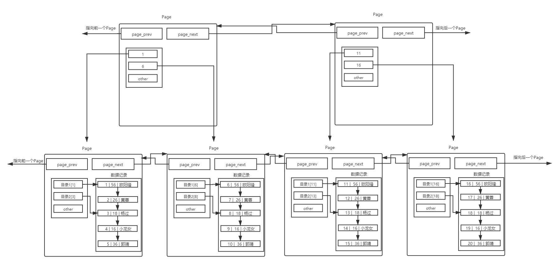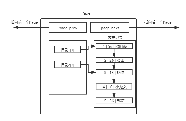 在一個Page內部,我們引入了目錄。比如,我們要查找id=4記錄,之前必須線性遍歷4次,才能拿到結果。現在直接通過目錄2[3],直接進行定位新的起始位置,提高了效率。