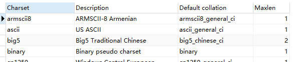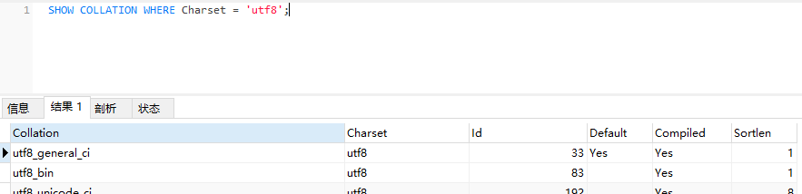 一個字符集對應(yīng)多個字符序,通過 SHOW COLLATION; 可以查看全部的字符序;也可以帶條件查具體某個字符集的字符序