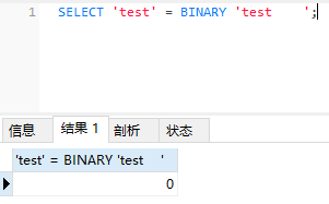 1、 BINARY ,類似 SELECT 'test' = BINARY 'test ';