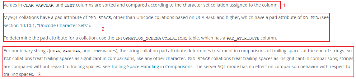 3、對于非二進(jìn)制字符串( CHAR 、 VARCHAR 、 TEXT ),字符序 pad 參數(shù)決定如何去處理字符串末尾的空格