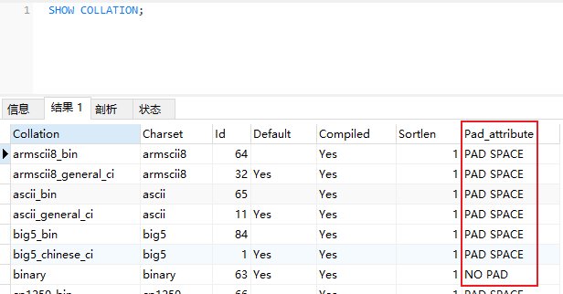 Pad_attribute 的值是 NO PAD ,也就是不會忽略字符串末尾的空格