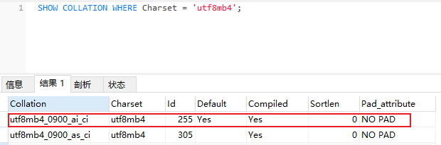 3、 MySQL8 開始,字符序增加了一個參數(shù) Pad_attribute ,該參數(shù)的值不同,對字符串末尾空格的處理方式不同