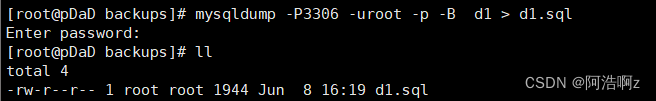 mysqldump -P3306 -u root -p 密碼 -B 數(shù)據(jù)庫名 > 數(shù)據(jù)庫備份存儲的文件路徑第一步:備份數(shù)據(jù)庫