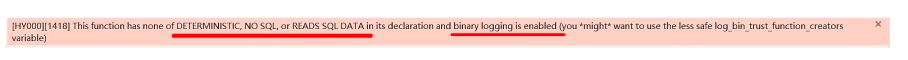 create function fun1(n int)returns int deterministicbegindeclare total int default 0;while n>0 doset total := total + n;set n := n - 1;end while;return total;end;select fun1(50);在 mysql8.0 版本中 binlog 默認是開啟的,一旦開啟了, mysql 就要求在定義存儲過程時,需要指定characteristic 特性,否則就會報如下錯誤:
