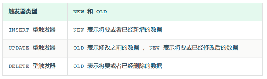 使用別名 OLD 和 NEW 來引用觸發(fā)器中發(fā)生變化的記錄內容,這與其他的數(shù)據(jù)庫是相似的。現(xiàn)在觸發(fā)器還只支持行級觸發(fā),不支持語句級觸發(fā)。