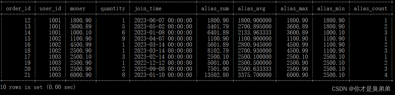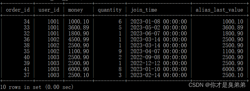 4.2.1、表結構DROP TABLE IF EXISTS `order_for_goods`;CREATE TABLE `order_for_goods` ( `order_id` int(0) NOT NULL AUTO_INCREMENT, `user_id` int(0) NULL DEFAULT NULL, `money` decimal(10, 2) NULL DEFAULT NULL, `quantity` int(0) NULL DEFAULT NULL, `join_time` datetime(0) NULL DEFAULT NULL, PRIMARY KEY (`order_id`) USING BTREE) ENGINE = InnoDB AUTO_INCREMENT = 12 CHARACTER SET = utf8 COLLATE = utf8_general_ci ROW_FORMAT = Dynamic;4.2.2、表數據INSERT INTO order_for_goods (user_id, money, quantity, join_time )VALUES( 1001, 1800.90, 1, '2023-06-07'),( 1001, 3600.89, 5, '2023-05-02'),( 1001, 1000.10, 6, '2023-01-08'),( 1002, 1100.90, 9, '2023-04-07'),( 1002, 4500.99, 1, '2023-03-14'),( 1003, 2500.10, 3, '2023-02-14'),( 1002, 2500.90, 1, '2023-03-14'),( 1003, 2500.90, 1, '2022-12-12'),( 1003, 2500.90, 2, '2022-09-08'), ( 1003, 6000.90, 8, '2023-01-10');4.2.3、普通函數做開窗函數1、語句如下