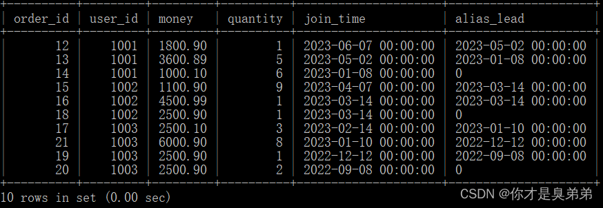 select *,lead(join_time, 1, 0) over(partition by user_id order by join_time desc) as alias_leadfrom order_for_goods;3、執行結果