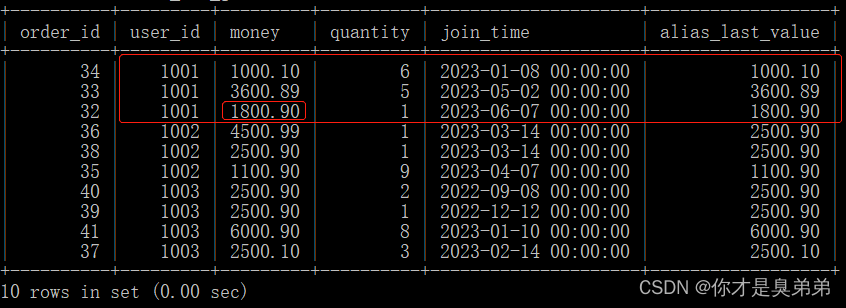 你可能會發現LAST_VALUE() 不是取窗口的最后一個值,窗口按照 user_id 分區,按照 join_time 列排序,按道理是返回1001分區中money為1800.90才對啊? 為什么? 為什么?原因是LAST_VALUE()默認統計范圍是 rows between unbounded preceding and current row