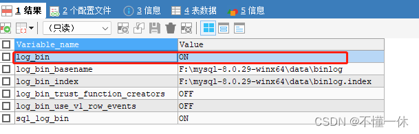 # 備份所有數據庫mysqldump -uroot -p123456 --all-databases > /backup/mysqldump/all.db# 恢復數據mysql -uroot -p db_name < /backup/mysqldump/db_name.db1、查看是否啟用 binlog 日志SHOW VARIABLES LIKE '%log_bin%'