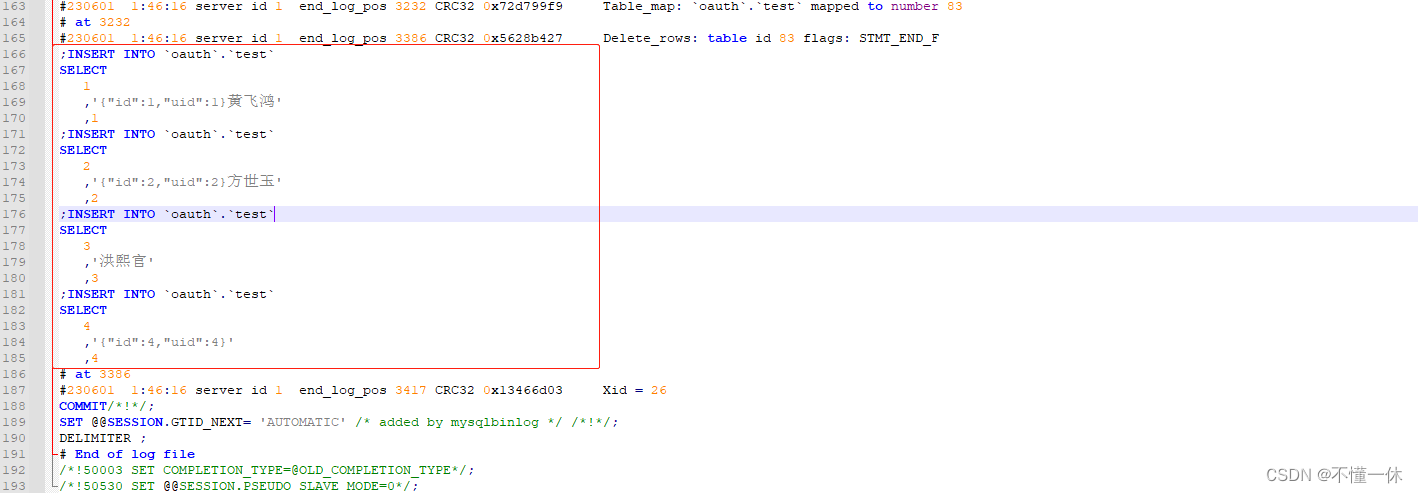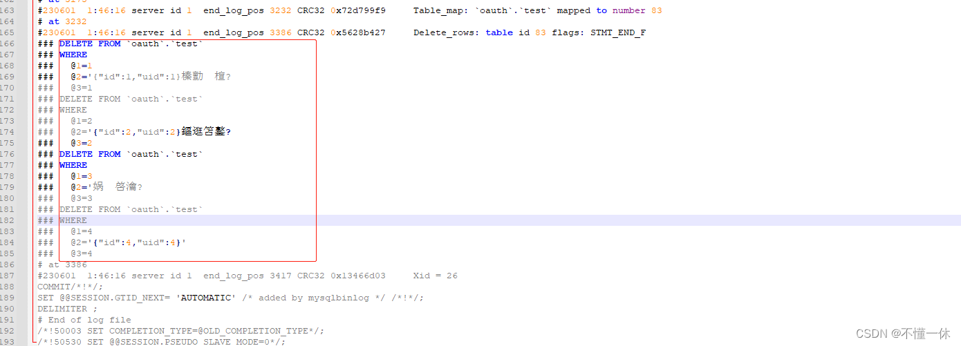 mysqlbinlog --no-defaults --base64-output=decode-rows -v --database=oauth --start-datetime='2023-06-01 01:44:00' --stop-datetime='2023-06-01 01:48:00' F:\mysql-8.0.29-winx64\data\binlog.000058 > E:\test\result\db.sql轉換成功如下,可以看到刪除 sql 的語句