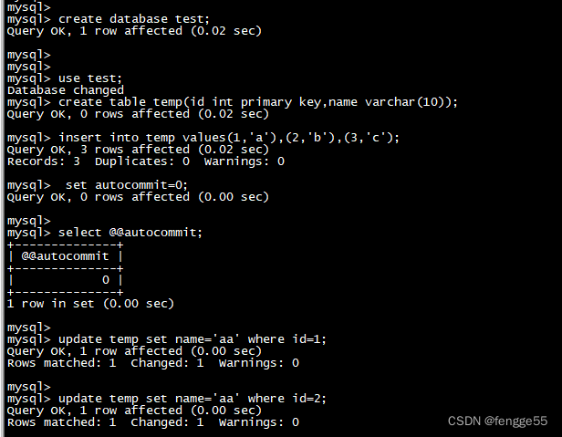 2.登錄打開第二個sessionmysql> set autocommit=0;Query OK, 0 rows affected (0.00 sec)mysql> mysql> select @@autocommit;+--------------+| @@autocommit |+--------------+| 0 |+--------------+1 row in set (0.00 sec)mysql> use testmysql> update temp set name='bb' where id=1; #執(zhí)行這條sql,會一直卡住。4.登錄MySQL,打開第三個session。