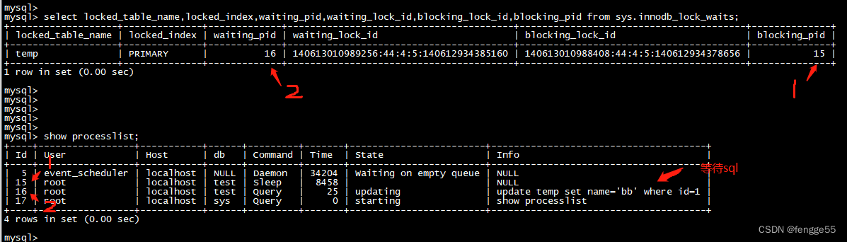 再次對比下。可以找到關(guān)系,1等待的事務(wù)處理,是被2阻塞了。也就是鎖住了,需要2釋放鎖,1才可以執(zhí)行