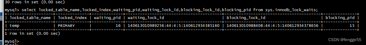 mysql> select locked_table_name,locked_index,waiting_pid,waiting_lock_id,blocking_lock_id,blocking_pid from sys.innodb_lock_waits;mysql> show processlist;