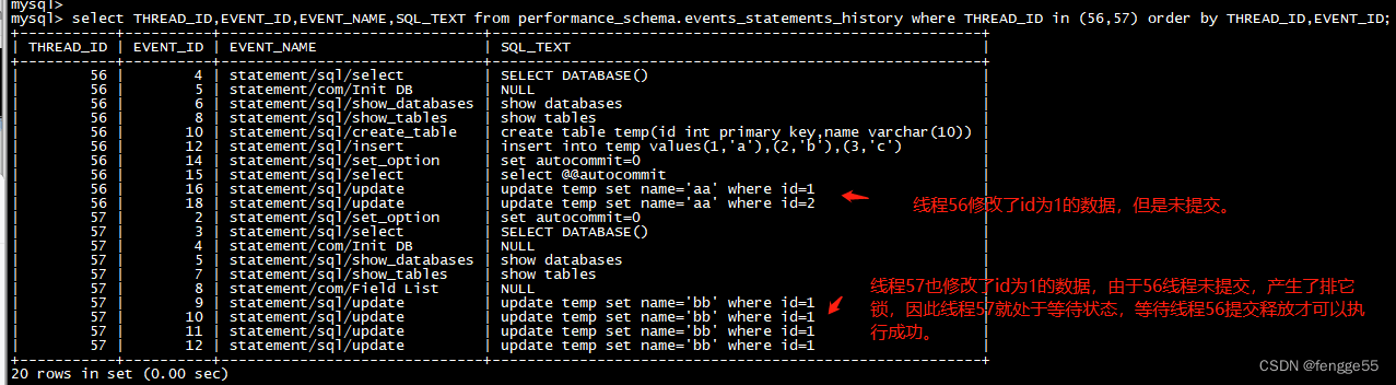 mysql> select THREAD_ID,EVENT_ID,EVENT_NAME,SQL_TEXT from performance_schema.events_statements_history where THREAD_ID in (56,57) order by THREAD_ID,EVENT_ID;