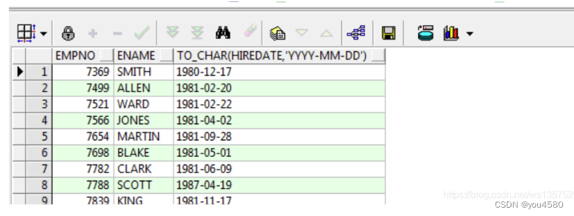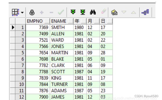 ----查詢出emp表中所有員工入職距離現(xiàn)在幾天。select sysdate-e.hiredate from emp e; 結(jié)果:以天為單位的小數(shù)----算出明天此刻select sysdate+1 from dual; 結(jié)果:2020/12/4 16:35:36----查詢出emp表中所有員工入職距離現(xiàn)在幾月。select months_between(sysdate,e.hiredate) from emp e; 結(jié)果:以月為單位的小數(shù)----查詢出emp表中所有員工入職距離現(xiàn)在幾年。select months_between(sysdate,e.hiredate)/12 from emp e; 結(jié)果:以年為單位的小數(shù)----查詢出emp表中所有員工入職距離現(xiàn)在幾周。select round((sysdate-e.hiredate)/7) from emp e; 結(jié)果:以周為單位的小數(shù)4、轉(zhuǎn)換函數(shù)4.1日期轉(zhuǎn)字符串:to_char()---日期轉(zhuǎn)字符串select to_char(sysdate, 'yyyy-mm-dd hh:mi:ss') from dual;結(jié)果:2020-12-04 05:18:03 12小時有0select to_char(sysdate, 'fm yyyy-mm-dd hh:mi:ss') from dual; 結(jié)果:2020-12-4 5:18:32 12小時無0select to_char(sysdate, 'fm yyyy-mm-dd hh24:mi:ss') from dual; 結(jié)果: 2020-12-4 17:18:47 24小時無0可以使用 TO_CHAR 函數(shù)來拆分年月日select empno,ename to_char(hiredate,'yyyy') 年, to_char(hiredate,'mm') 月, to_char(hiredate,'dd') 日from emp;