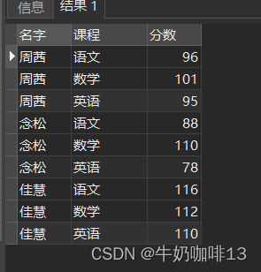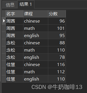 SELECT 'name' 名字,course 課程,score 分數 from 'grade2' unpivot (score for course in('chinese','math','english'));