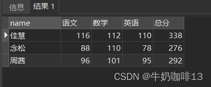 SELECT t.*,(t.語文+t.數學+t.英語)總分 from ((SELECT 'name','course','score' from 'grade')pivot( max('score') for 'course' in('語文' 語文,'數學' 數學,'英語' 英語)))t ORDER BY 'name';