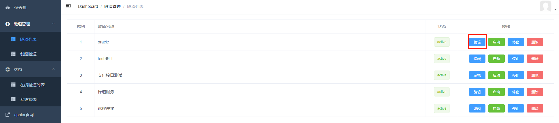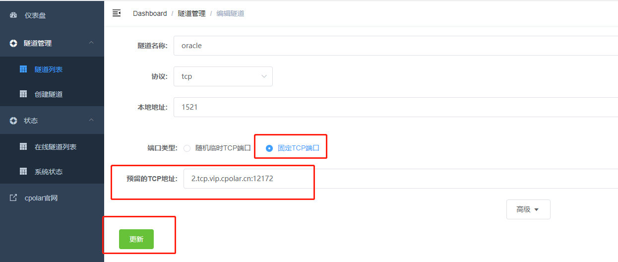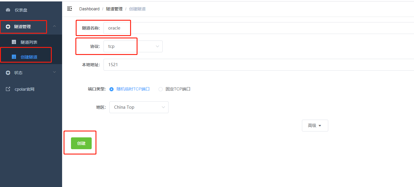 登錄成功后,點擊左側儀表盤的隧道管理——創建隧道,創建一個 tcp 協議的隧道指向本地 1521 端口(oracle默認端口)