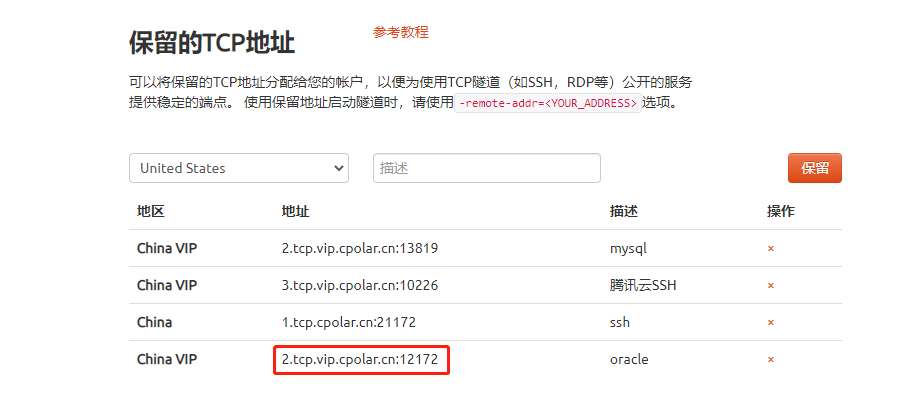 4.1 保留一個固定的公網TCP端口地址登錄 cpolar 官網,點擊左側的預留,選擇保留的 TCP 地址,我們先來為遠程 Oracle 保留一個固定端口地址。