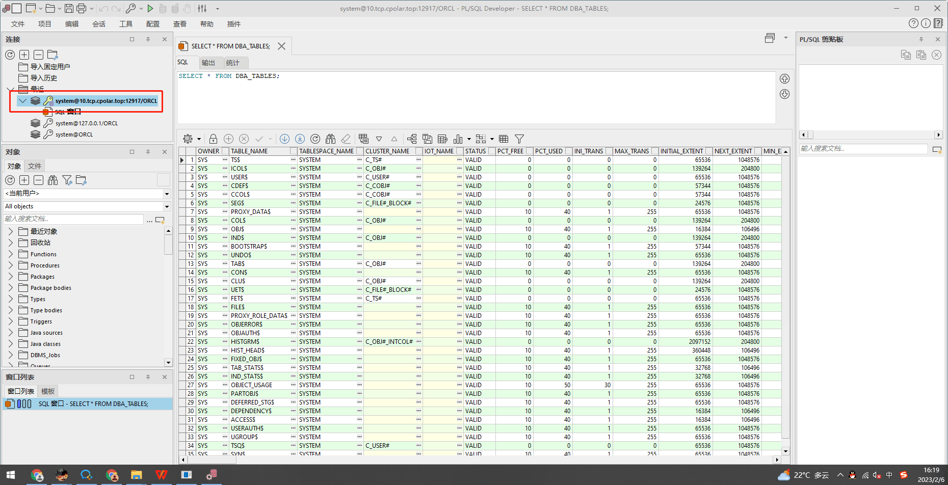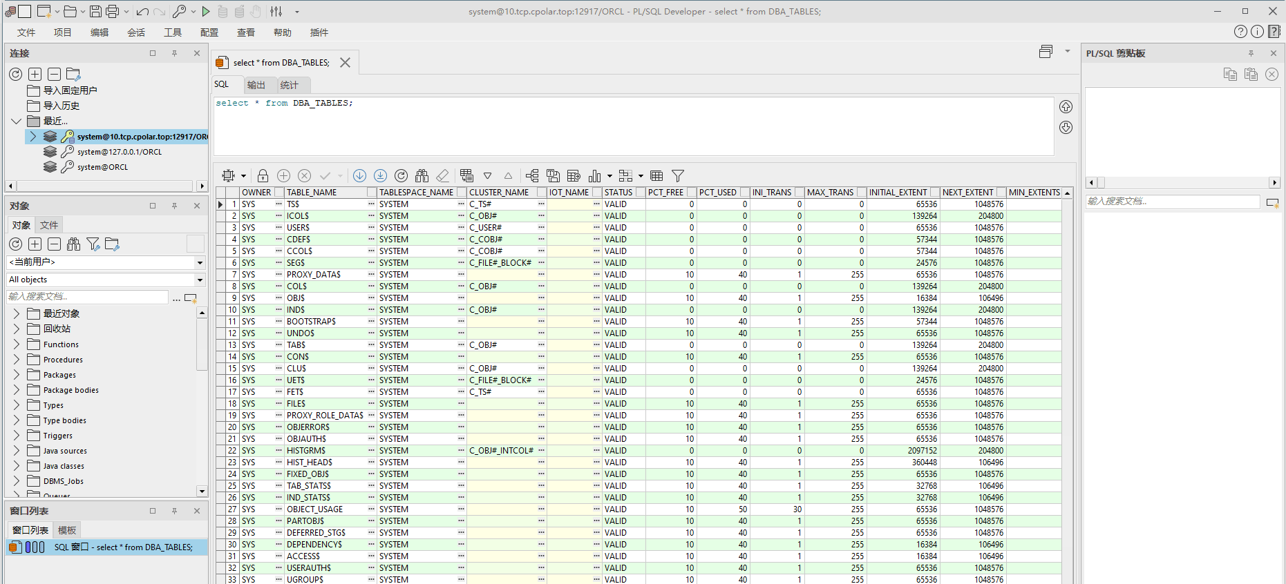登錄后執行查詢系統表格 select * from DBA_TABLES,出現數據表示連接成功