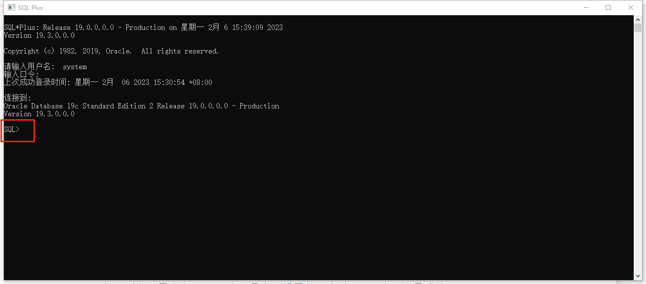 打開后輸入用戶名:system,密碼是上面設置的口令,出現sql表示登錄成功