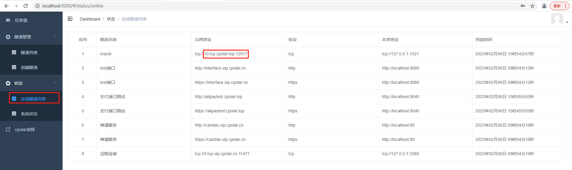 隧道創建成功后,點擊左側的狀態——在線隧道列表,可以看到,剛剛創建的隧道已經有生成了相應的公網地址,將其復制下來