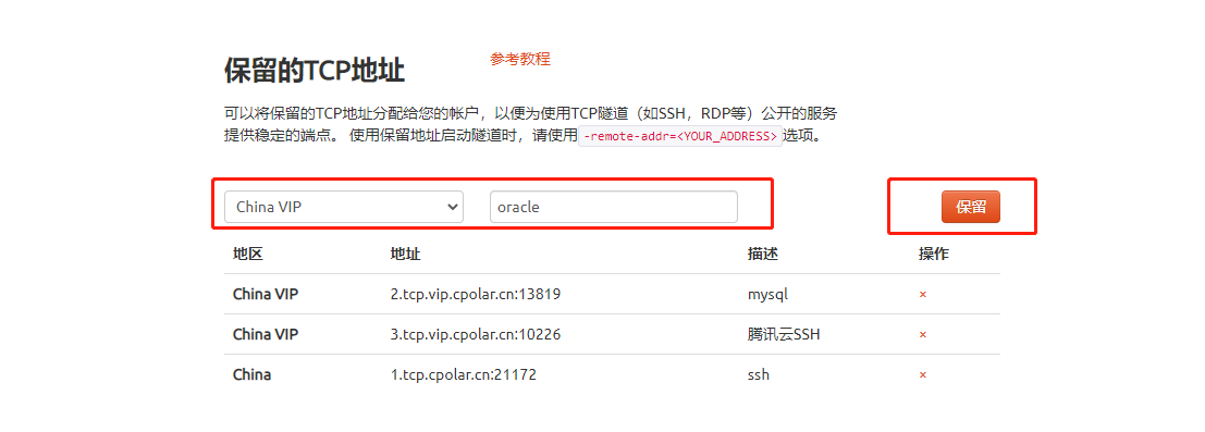 4.1 保留一個固定的公網TCP端口地址登錄cpolar官網,點擊左側的預留,選擇保留的TCP地址,我們先來為遠程Oracle保留一個固定端口地址。