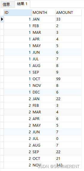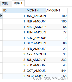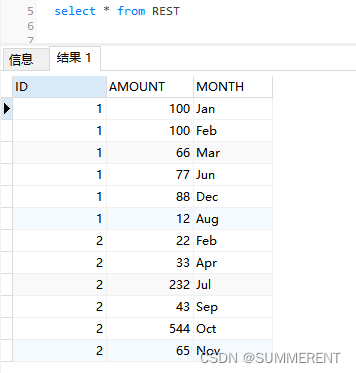 目錄1、準備數據:REST表2、查詢數據3、行轉列方式1:使用 case when then方式方式2: 使用 decode函數方式3:使用pivot函數4、列轉行5、直接使用unpivot函數 --列轉行總結 1、準備數據:REST表-- 創建表RESTCREATE TABLE REST ( 'ID' NUMBER, 'AMOUNT' NUMBER(19,0), 'MONTH' VARCHAR2(255 BYTE));--執行添加數據語句INSERT INTO 'CERPAWCSADM'.'REST' VALUES ('1', '100', 'Jan');INSERT INTO 'CERPAWCSADM'.'REST' VALUES ('1', '100', 'Feb');INSERT INTO 'CERPAWCSADM'.'REST' VALUES ('1', '66', 'Mar');INSERT INTO 'CERPAWCSADM'.'REST' VALUES ('1', '77', 'Jun');INSERT INTO 'CERPAWCSADM'.'REST' VALUES ('1', '88', 'Dec');INSERT INTO 'CERPAWCSADM'.'REST' VALUES ('1', '12', 'Aug');INSERT INTO 'CERPAWCSADM'.'REST' VALUES ('2', '22', 'Feb');INSERT INTO 'CERPAWCSADM'.'REST' VALUES ('2', '33', 'Apr');INSERT INTO 'CERPAWCSADM'.'REST' VALUES ('2', '232', 'Jul');INSERT INTO 'CERPAWCSADM'.'REST' VALUES ('2', '43', 'Sep');INSERT INTO 'CERPAWCSADM'.'REST' VALUES ('2', '544', 'Oct');INSERT INTO 'CERPAWCSADM'.'REST' VALUES ('2', '65', 'Nov');2、查詢數據