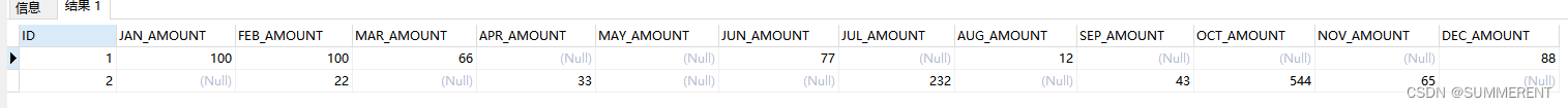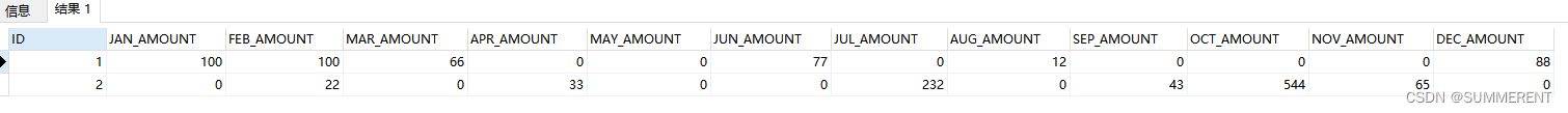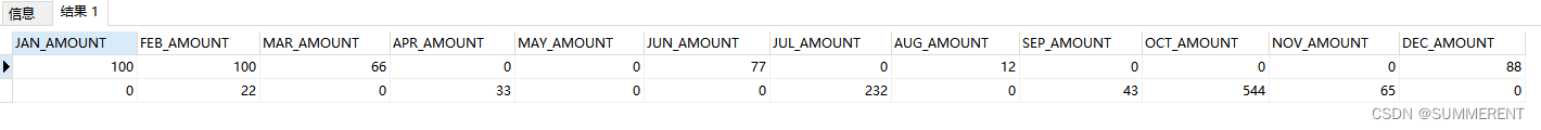 SELECT* FROM REST pivot (SUM(amount) FOR month IN ('Jan' AS Jan_amount,'Feb' AS Feb_amount,'Mar' AS Mar_amount,'Apr' AS Apr_amount,'May' AS May_amount,'Jun' AS Jun_amount,'Jul' AS Jul_amount,'Aug' AS Aug_amount,'Sep' AS Sep_amount,'Oct' AS Oct_amount,'Nov' AS Nov_amount,'Dec' AS Dec_amount ) );結果為:這個結果會發現,如果數據為空沒有賦值為0