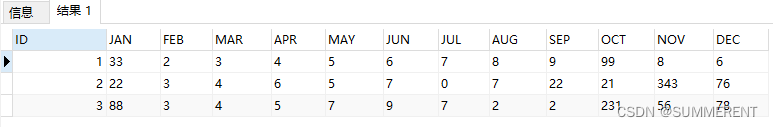 CREATE TABLE TEST ( 'ID' NUMBER(12,0) NOT NULL, 'JAN' VARCHAR2(255 BYTE), 'FEB' VARCHAR2(255 BYTE), 'MAR' VARCHAR2(255 BYTE), 'APR' VARCHAR2(255 BYTE), 'MAY' VARCHAR2(255 BYTE), 'JUN' VARCHAR2(255 BYTE), 'JUL' VARCHAR2(255 BYTE), 'AUG' VARCHAR2(255 BYTE), 'SEP' VARCHAR2(255 BYTE), 'OCT' VARCHAR2(255 BYTE), 'NOV' VARCHAR2(255 BYTE), 'DEC' VARCHAR2(255 BYTE));-- 插入數據INSERT INTO 'CERPAWCSADM'.'TEST' VALUES ('1', '33', '2', '3', '4', '5', '6', '7', '8', '9', '99', '8', '6');INSERT INTO 'CERPAWCSADM'.'TEST' VALUES ('2', '22', '3', '4', '6', '5', '7', '0', '7', '22', '21', '343', '76');INSERT INTO 'CERPAWCSADM'.'TEST' VALUES ('3', '88', '3', '4', '5', '7', '9', '7', '2', '2', '231', '56', '78');查詢出的數據