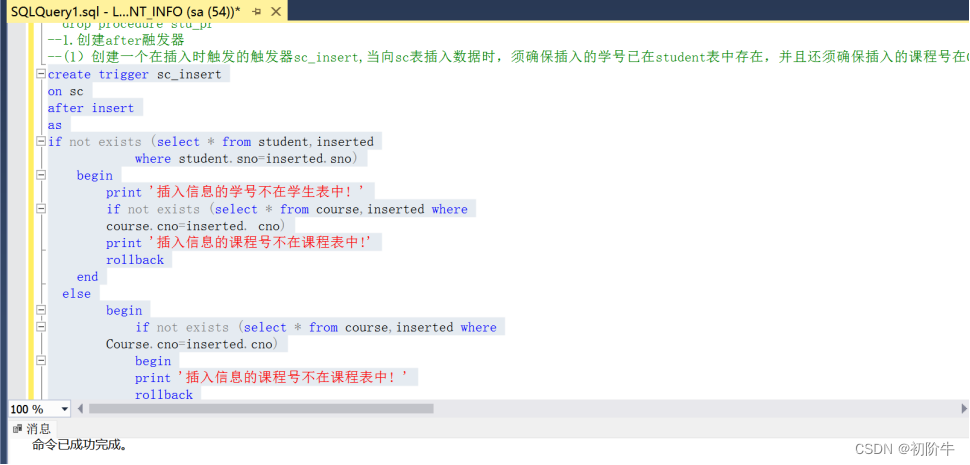 create trigger sc_inserton scafter insertasif not exists (select * from student,insertedwhere student.sno=inserted.sno)beginprint '插入信息的學(xué)號不在學(xué)生表中! 'if not exists (select * from course,inserted wherecourse.cno=inserted. cno)print '插入信息的課程號不在課程表中!'rollbackend elsebeginif not exists (select * from course,inserted whereCourse.cno=inserted.cno)beginprint '插入信息的課程號不在課程表中! 'rollbackendend