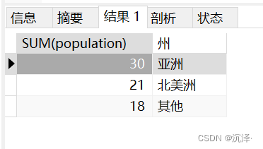 SELECT SUM(population)FROM Table_A GROUP BYCASE country WHEN '中國(guó)' THEN '亞洲' WHEN '印度' THEN '亞洲'WHEN '日本' THEN '亞洲' WHEN '美國(guó)' THEN '北美洲' WHEN '加拿大' THEN '北美洲' WHEN '墨西哥' THEN '北美洲' ELSE '其他' END;運(yùn)行結(jié)果: