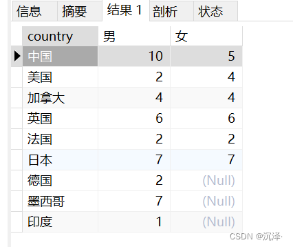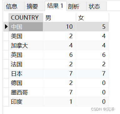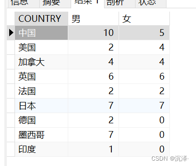 SELECTa.country,(SELECTSUM( a1.population ) FROMtable_a a1 WHEREa1.country = a.country AND a1.sex = '男' ) 男,(SELECTSUM( a1.population ) FROMtable_a a1 WHEREa1.country = a.country AND a1.sex = '女' ) 女 FROMtable_a a GROUP BYa.country;執(zhí)行結(jié)果: