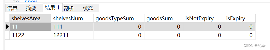 SELECTshelves_area shelvesArea,shelves_num shelvesNum,COUNT( DISTINCT goods_type ) goodsTypeSum,COUNT( goods_id ) goodsSum,SUM(CASE WHEN (shelves_id = goods_shelvesId AND goods_expiryTime < NOW()) THEN 1 ELSE 0 END) isNotExpiry,SUM(CASE WHEN (shelves_id = goods_shelvesId AND goods_expiryTime > NOW()) THEN 1 ELSE0 END) isExpiryFROMshelvesLEFT JOIN goods ON shelves_id = goods_shelvesIdGROUP BY shelves_id;兩個(gè)不同寫(xiě)法的運(yùn)行結(jié)果是一樣的,但是性能效率上case when 顯然比子查詢(xún)的高一些。運(yùn)行結(jié)果如下(本人未造相關(guān)測(cè)試數(shù)據(jù)):