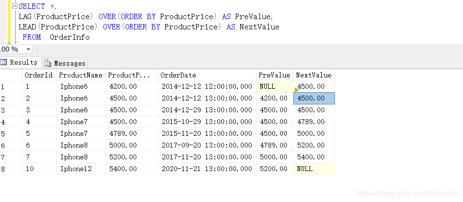 SELECT *, LAG(ProductPrice) OVER(ORDER BY ProductPrice) AS PreValue,LEAD(ProductPrice) OVER(ORDER BY ProductPrice) AS NextValueFROM OrderInfo