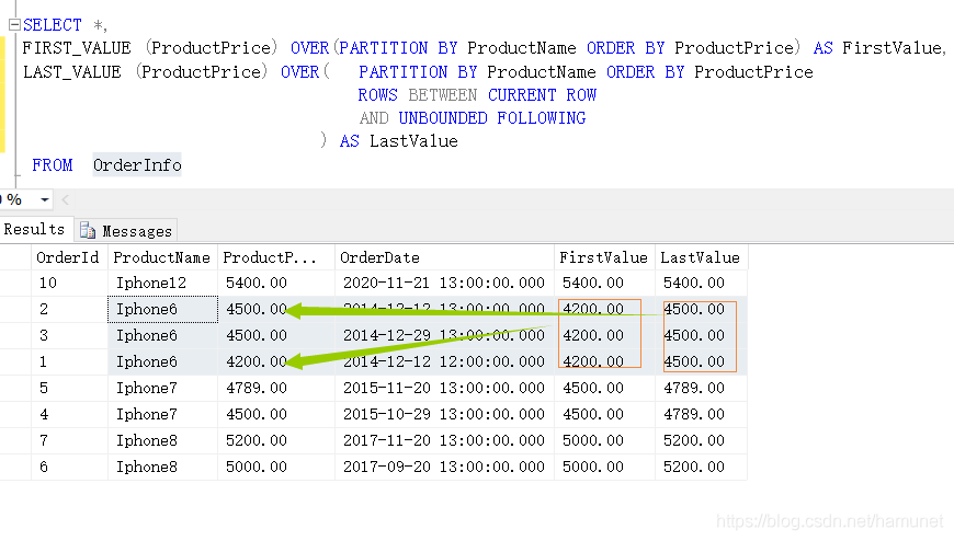 SELECT *, FIRST_VALUE (ProductPrice) OVER(PARTITION BY ProductName ORDER BY ProductPrice) AS FirstValue,LAST_VALUE (ProductPrice) OVER( PARTITION BY ProductName ORDER BY ProductPrice ROWS BETWEEN CURRENT ROW AND UNBOUNDED FOLLOWING ) AS LastValue FROM OrderInfo