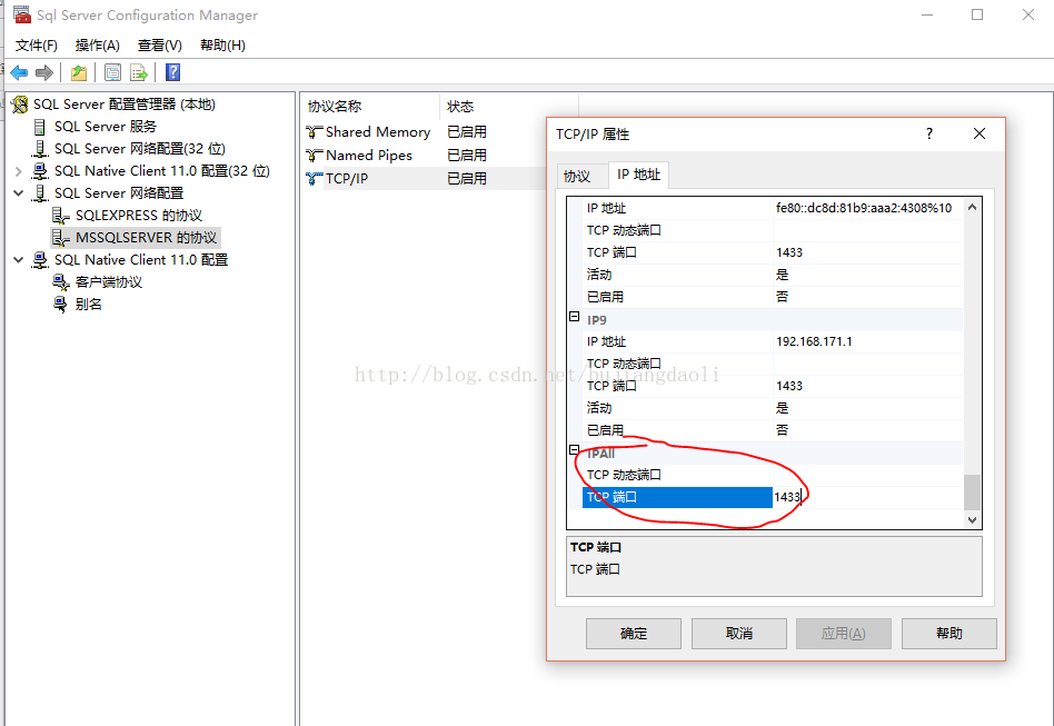 (1)打開SQLServer 配置管理器------->SQLServer for MSQLSERVER------->TCP/IP------->如果沒有啟動,則啟動------->右鍵屬性------->IPAddresses------->IP All------->將TCP端口改為1433;