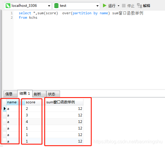 sum(score) over(partition by name )sum()是聚合函數,其實我聚合函數還沒學明白,當 sum()函數 后面跟上 over()以后,由sum聚合函數就成為了開窗函數。over() 括號里面就是定義窗口的內容了,partition 是分區,分組的意思。partition by 就是根據某個字段分組。所以sum(score) over(partition by name ) ,就是先根據 name 分組(如圖),當前面加了sum(score)后就把根據name分組后的,每個(組)窗口里面的字段 score進行求和操作。