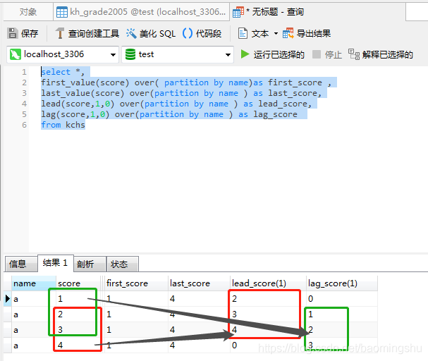lead(score,1,0) over(partition by name ) as lead_score--根據name分區(組),score列當前行的上面N行,,如果沒有就為默認值0lag 是取當前行的下 N 條數據,并且可以設置默認值