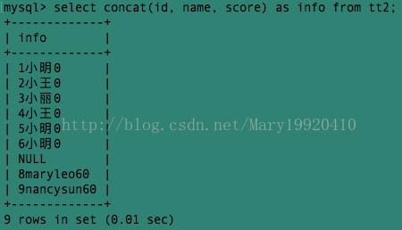 select concat (id, name, score) as info from tt2;#解釋:建立一個info的列,內容來自tt2表,內容為id,name,score連接的結果(有就連接 沒有就不連接 第七行為null 是因為tt2表中的score為null)