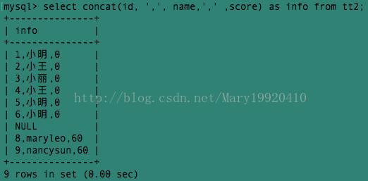 select concat(id,',',name,',',score)? as info from tt2#表示三列id,name,score進行連接,中間用 逗號相連 。可以讓字符串的連接更加清楚。