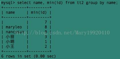 select name,min(id) from tt2 group by name;#查詢了name相同的的人中最小的id