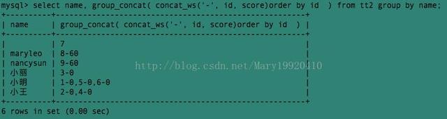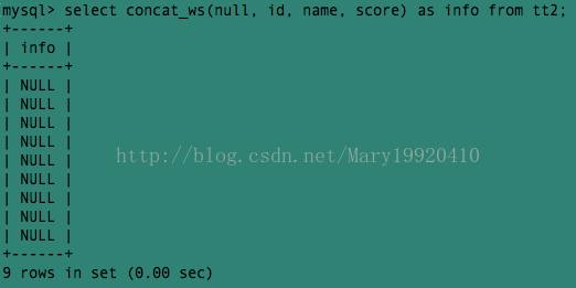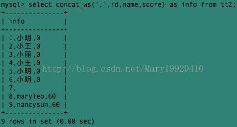 select concat_ws(',',id,name,score) as info from tt2對三個字符串進行逗號連接,逗號只用寫一次~
