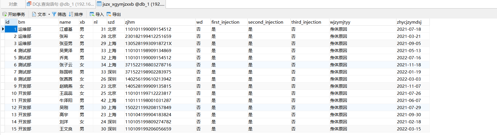 insert into jszx_xgymjzxxb (id, bm, name, xb, nl, szd, zjhm, wd, first_injection, second_injection, third_injection, wjzymjtyy, zhycjzymdsj) values ('8','測試部','張茜茜','女','26','深圳','140256199610213942','否','是','是','否','身體原因','2022-03-03');